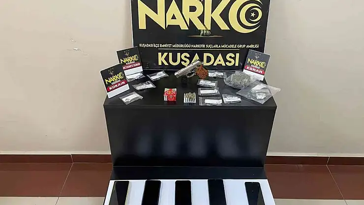 Aydın'ın Kuşadası ilçesinde narkotik ekipleri uyuşturucu sattıkları tespit edilen 3 farklı mahalledeki adreslere operasyon düzenlerken, yapılan aramalarda çok sayıda uyuşturucu ve silah ele geçirildi.