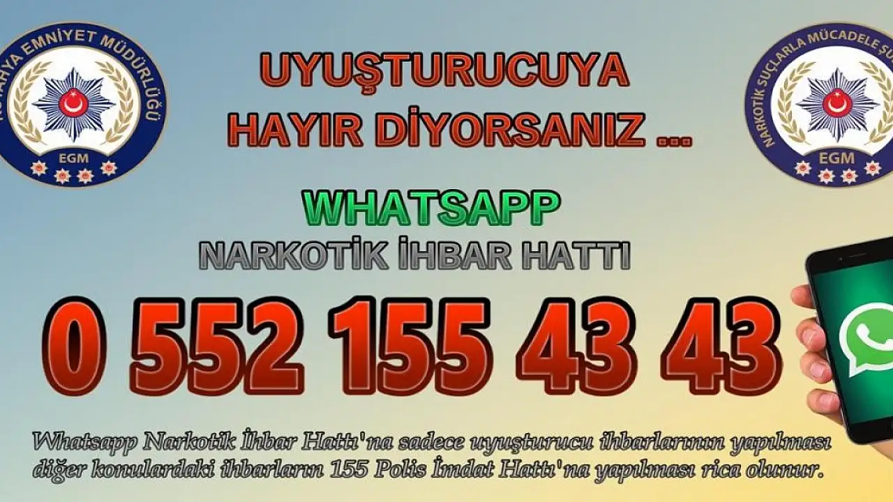 Konuyla ilgili Kütahya İl Emniyet Müdürlüğü'nden yapılan açıklamada, "Kütahya İl Emniyet Müdürlüğümüzce Narkotik Suçlarla Mücadelemizde siz duyarlı vatandaşlarımızın desteğini almak, bizlere ulaşmanızı kolaylaştırmak ve daha seri bir şekilde suç ve suçluya ulaşabilmek amacıyla faaliyete geçirilen 0 552 155 43 43 numaralı "Narko Mobil WhatsApp" ihbar hattımıza tanık olduğunuz uyuşturucu satışı, kullanımı ve dağıtımı gibi durumlarda anında sesli, görüntülü veya yazılı ihbarlarda bulunabilir, konum, fotoğraf ve video gönderebilirsiniz. İhbar hattımıza gelen tüm ihbarlar değerlendirilecek ve kimliğiniz kesinlikle gizli tutulacaktır. Ayrıca verdiğiniz bilgiler üçüncü kişilerle paylaşılmayacaktır" ifadelerine yer verildi.
