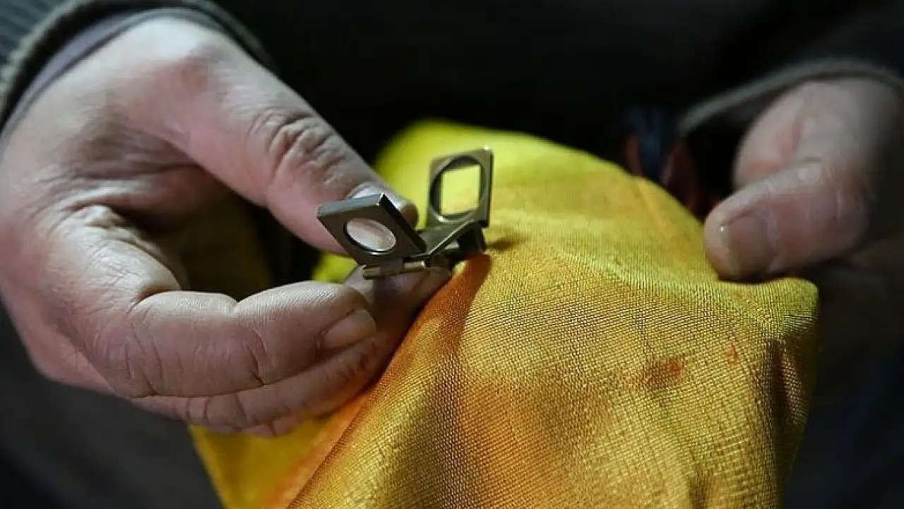 Büyüklerinin emaneti olarak gördükleri mercekle kutnu dokumasının atkı ve çözgü sayılarını ölçen ustalar, gözü gibi baktıkları merceği gururla taşıyor.
