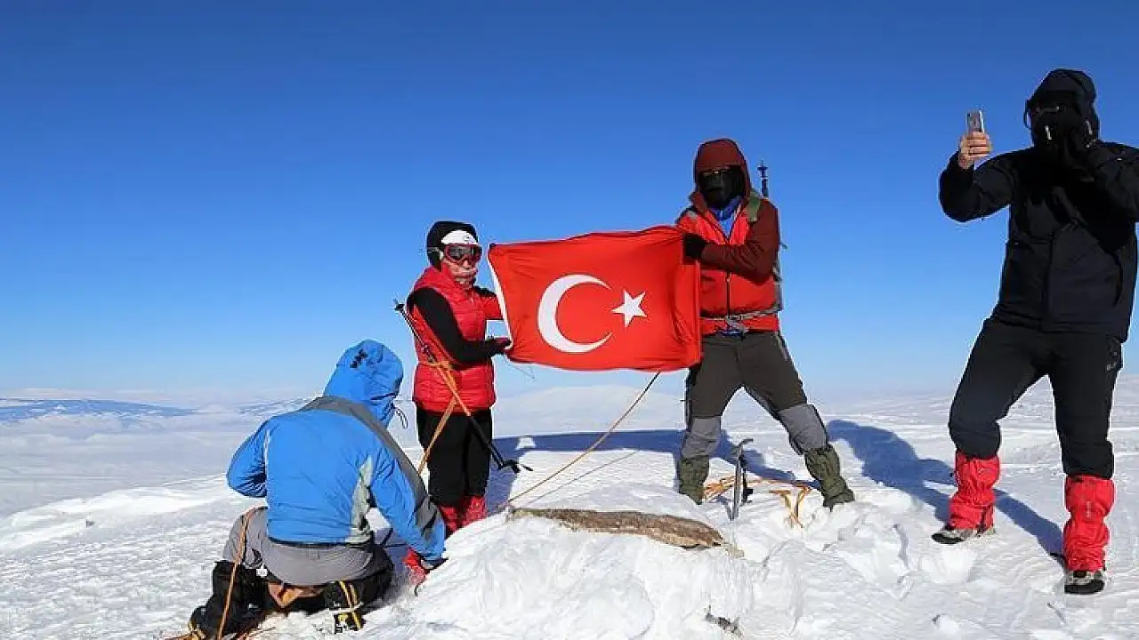 Dağcılar yer yer kar kalınlığının 2 metreye ulaştığı, hava sıcaklığının ise sıfırın altında 35 dereceye kadar düştüğü bölgede 9 saat süren tırmanış sonrası dağın zirvesine ulaştıktan sonra Türk Bayrağı açarak birlik ve beraberlik mesajı verdi.