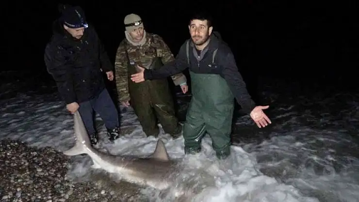 Antalya'nın Manavgat ilçesinde Alara Çayı'nın denize döküldüğü yerde balık tutan vatandaşların oltasına 2 metre boyunda yaklaşık 150 kilogram ağırlığında köpekbalığı takıldı. Dev bir kuzu balığı yakaladıkları umuduyla makinaya sarılan balıkçılar, gördükleri manzara karşısında şaşkına döndü.