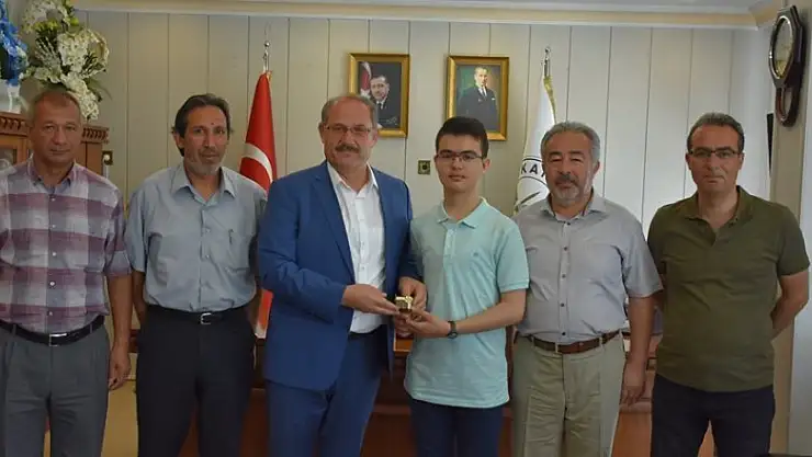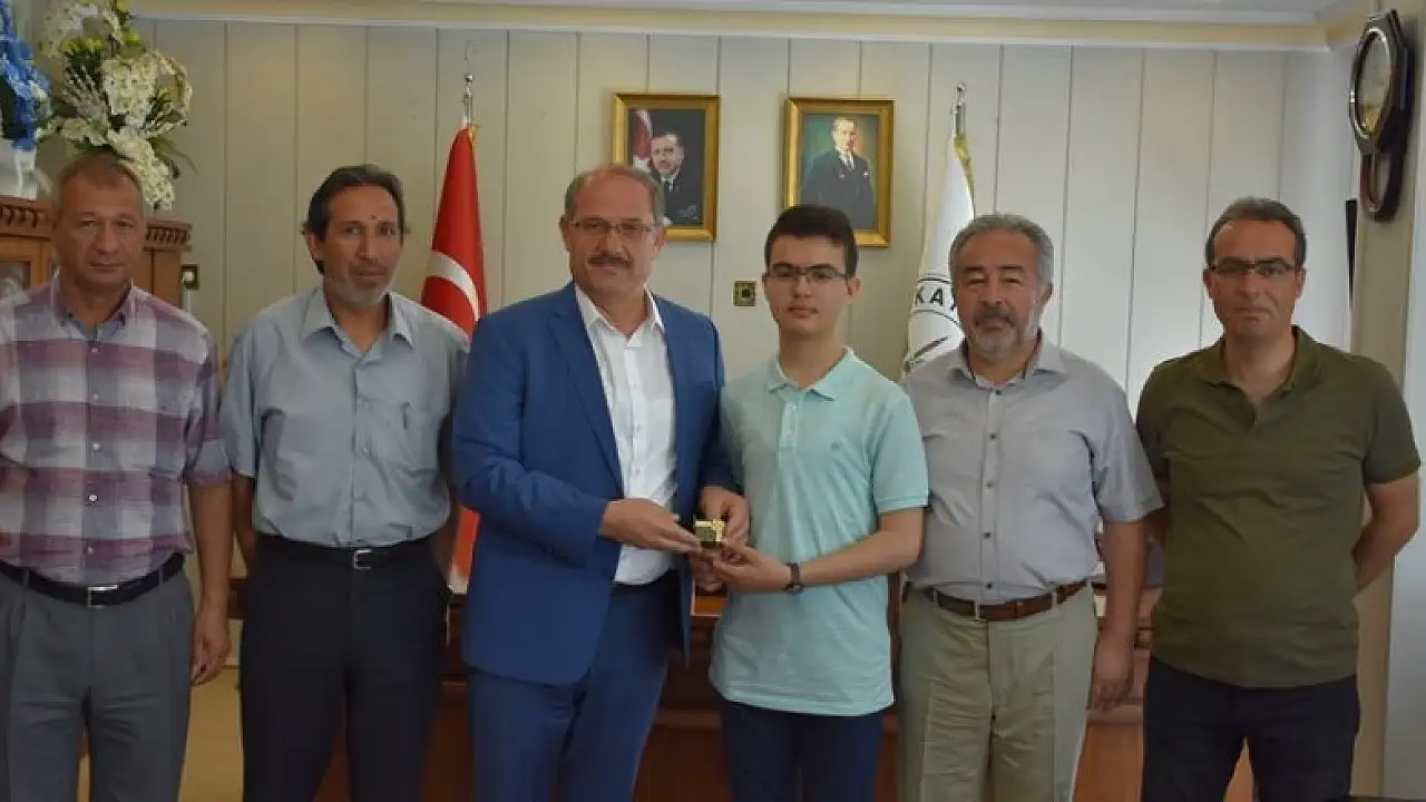 Başkan Yaka, öğrenci Taha Erdoğan Keleş'i altınla ödüllendirdi.