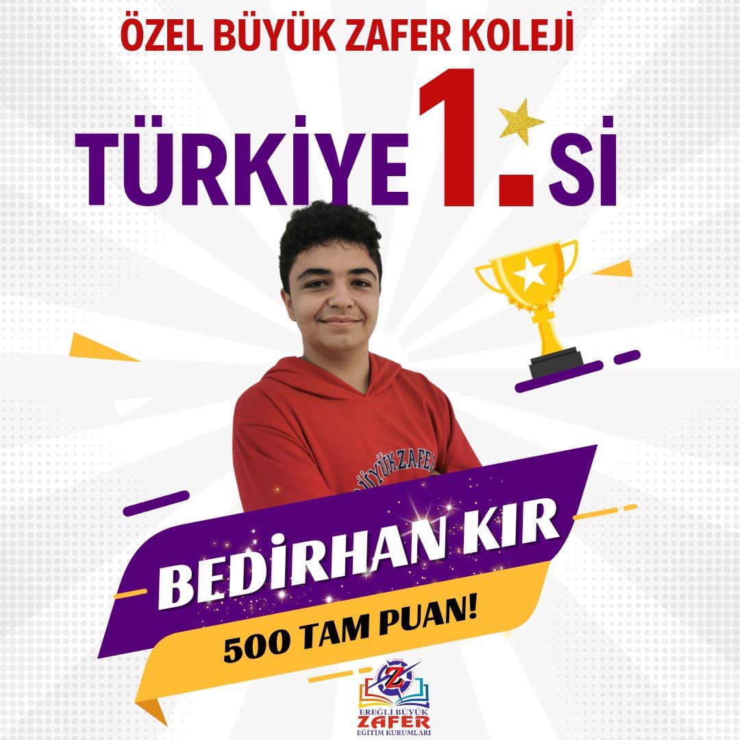 Tüm sorulara doğru yanıt veren Ereğli Zafer Ortaokulu Öğrencisi Bedirhan Kır, Türkiye birincisi oldu.