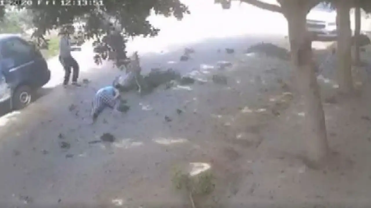 The video shows three people walking on the road and falling from an explosion, with debris scattered around and tree branches on the ground.