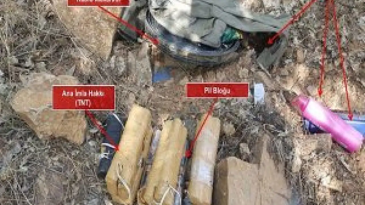 Bölücü terör örgütü üyelerince gizlenmiş halde 10 el yapımı patlayıcı, 7 tüp, 100 gram C-4, 900 gram amonyum nitrat, 920 metre kablo, patlayıcı yapımında kullanılan malzemeler ile silah, mühimmat, teçhizat, örgütsel doküman, tıbbi ve yaşam malzemeleri bulundu.