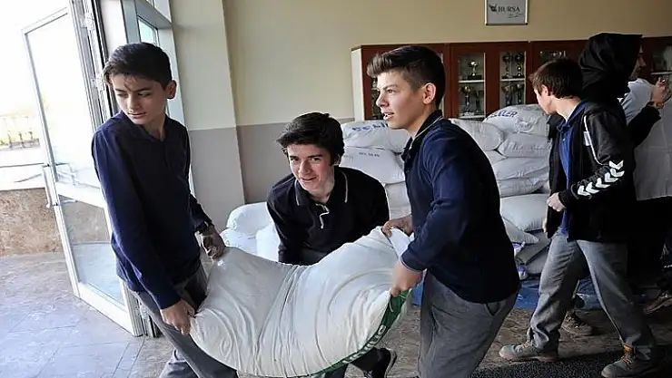 Kendi harçlıklarının yanı sıra aile ve yakınlarının maddi desteğiyle bir hafta içinde 5 bin ton un alan öğrenciler, unu Suriye'nin Halep bölgesine ulaştırılması için Bursa İHH İnegöl Temsilciliği yetkililerine okul bahçesinde teslim etti.