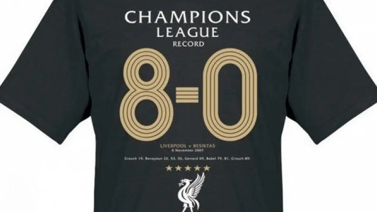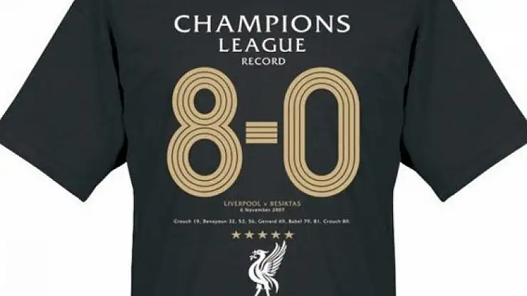 Liverpool'un Beşiktaş karşısında aldığı 8-0'lık galibiyet, Şampiyonlar Ligi'ndeki en farklı skor olarak tişörte basıldı. Maçın sonucunun ve golleri atan futbolcuların isimlerinin bulunduğu tişörtün satış fiyatı 19 Pound olarak belirlendi..