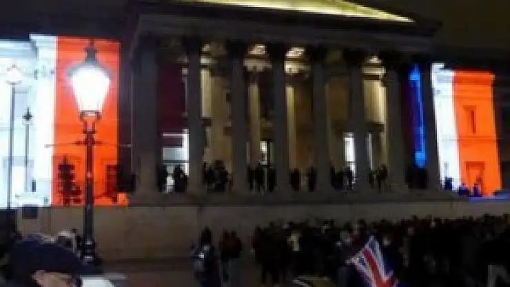 Londra'nın en büyük meydanı Trafalgar Meydanı'ndaki Ulusal Resim Galeri'nin duvarlarına projetörlerle Fransız bayrağının renkleri yansıtılırken, meydandaki havuzların fıskiyelerinden kırmızı, beyaz ve mavi renkte ışıklandırılmalar konuldu.