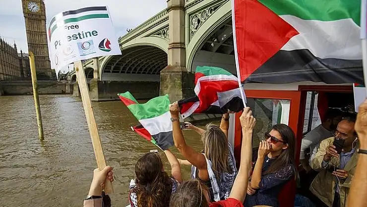 Bazı Filistinli sivil toplum örgütleri ile İngiliz aktivistler, kiraladıkları tekneyle Thames Nehri üzerinde Özgürlük Filosuyla dayanışma eylemi gerçekleştirdi.