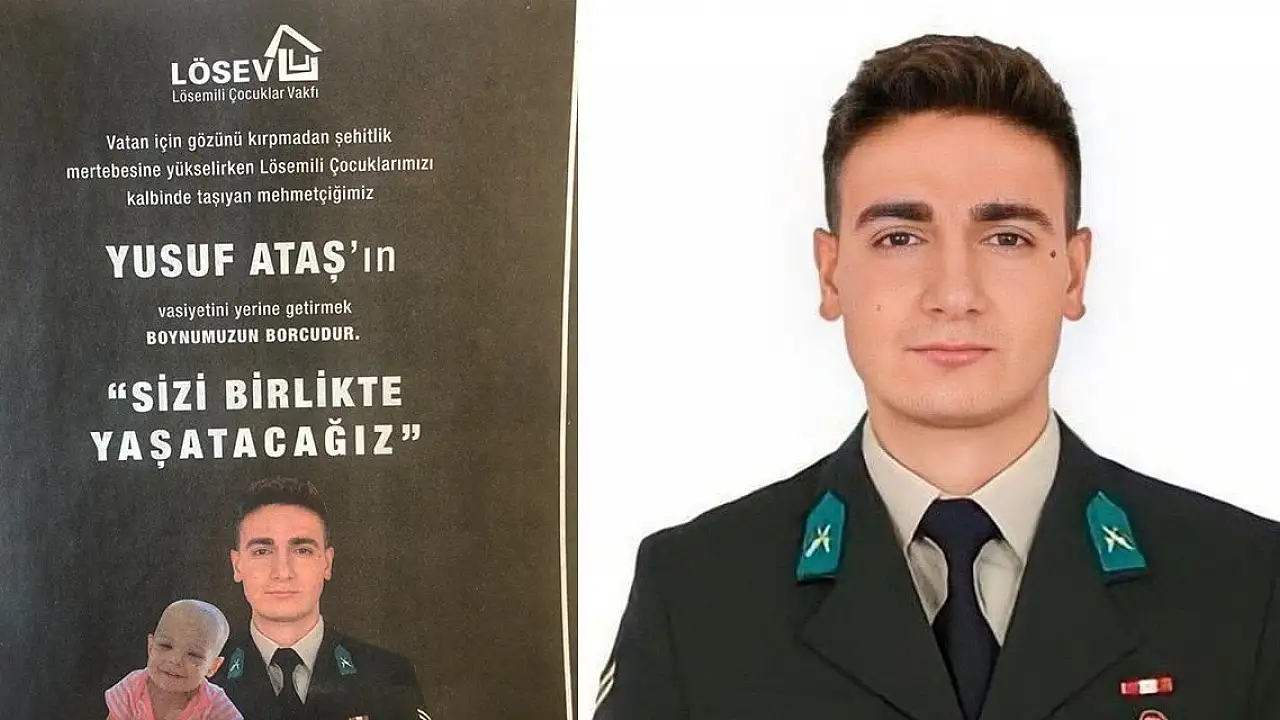 LÖSEMİLİ Çocuklar Sağlık ve Eğitim Vakfı (LÖSEV), lösemili bir çocuğun eğitim masraflarının karışlanmasını vasiyet eden şehit Piyade Astsubay Çavuş Yusuf Ataş (21) için gazeteye ilan verdi. İlanda, şehit Ataş ile lösemili çocuğun fotoğrafına yer verilerek, "Sizi birlikte yaşatacağız" denildi.
