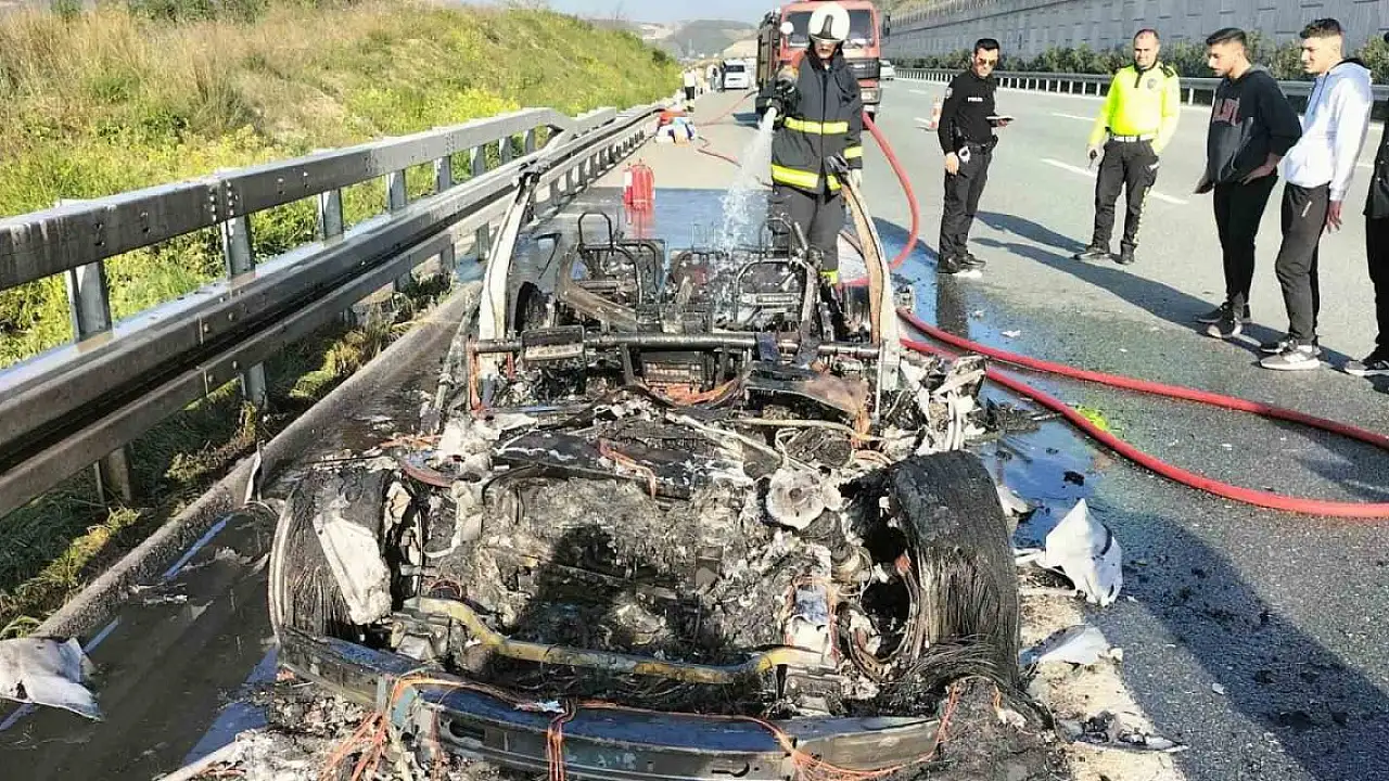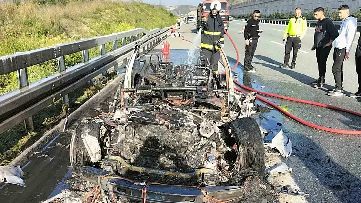 İstanbul- İzmir otoyolu Gemlik Sanayi kavşağında, Ukraynalı sürücünün kullandığı Tesla marka elektrikli otomobil, bir anda alev aldı. Sürücü otomobilden son anda çıkarak canını kurtarırken, otomobil alev topuna dönerek kül oldu.