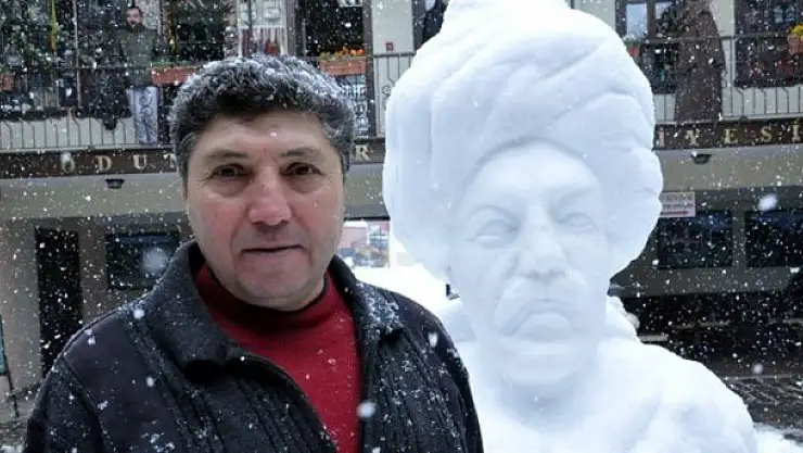 Eskişehir'de lüle taşı ustalarınca kardan yapılan yaklaşık 2 metre boyundaki büyük Türk düşünürü ve halk ozanı Yunus Emre'nin heykeli vatandaşlardan ilgi gördü.