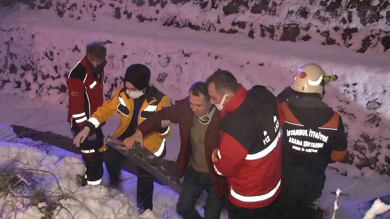 Maltepe'de yoğun kar yağışıyla birlikte aracının hakimiyetini kaybeden sürücü, 50 metre sürüklenerek dereye uçtu. Kazada baba ve oğul yaralandı. Olay yerine gelen sağlık ekipleri yaralıları görüntüleyen basın mensuplarına saldırdı. Kazanın yaşandığı alan havadan görüntülendi.