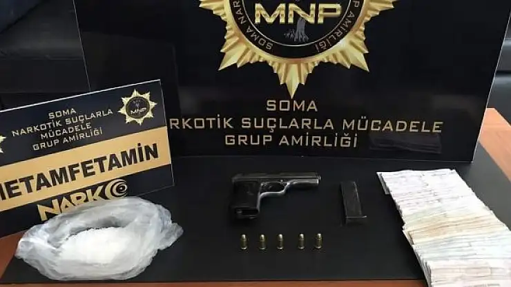 Uyuşturucu veya uyarıcı madde ticareti yapan, nakleden ve kullanan şahıslara yönelik yapılan çalışmalar kapsamında Soma ilçesinde durdurulan bir araçta, şahsın ikametinde ve iş yerinde yapılan aramada; 55,63 gram Metamfetamin maddesi, 42 adet Sentetik Ecza, 8 gram Esrar maddesi, 6 kök Hint Keneviri bitkisi, 4 adet Ecstasy hap, 1 adet Hassas Terazi, 2 adet uyuşturucu madde kullanmaya yarayan aparat, 1 adet ruhsatsız tabanca, 4 adet şarjör ve 5 adet fişek, 129 adet cinsel içerikli ürün ve 12 bin 455 TL uyuşturucu madde ticaretinden elde edildiği değerlendirilen para ele geçirildi.