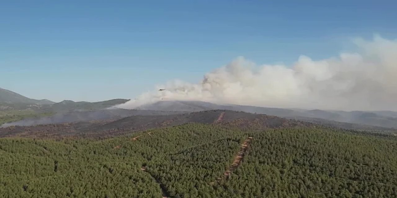 Manisa'nın Akhisar ilçesine bağlı Karaköy Mahallesi'nde öğle saatlerinde başlayan orman yangınına havadan ve karadan yoğun müdahale sürüyor.