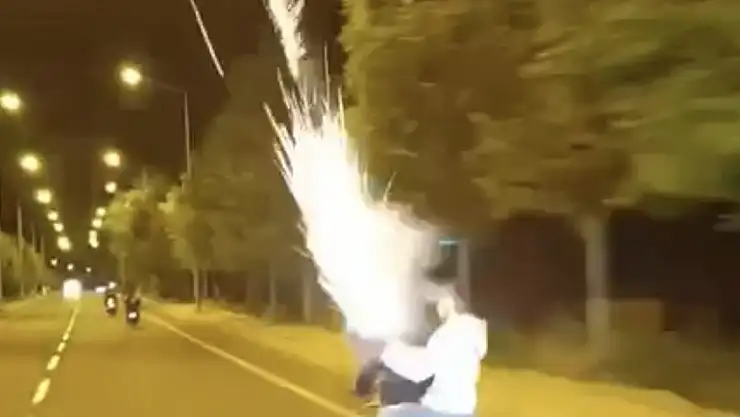 Mardin'in Mazıdağı ilçesinde Galatasaray'ın 24. şampiyonluğunu coşkuyla kutlayan taraftarlar tehlikeli harekette bulunarak, hareket halinde olan motosikletin üstünde ellerindeki havai fişeği patlattılar.