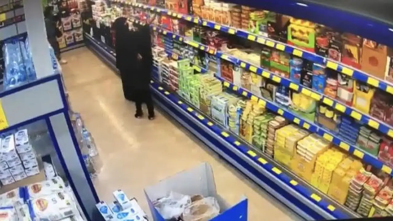 Market çalışanının hırsızlık yapıldığını tespit ettiği güvenlik kamera kayıtlarında, Heyam K.'nın aldığı ürünlerin bir kısmını elindeki siyah poşete koyup sakladığı, bir kısmını ise kasaya götürerek ödeme yaptığı görülüyor. Öte yandan ödeme yapmasının ardından çıkışa yönelen kadın, hırsızlık yaptığını tespit eden market çalışanı tarafından durduruluyor.