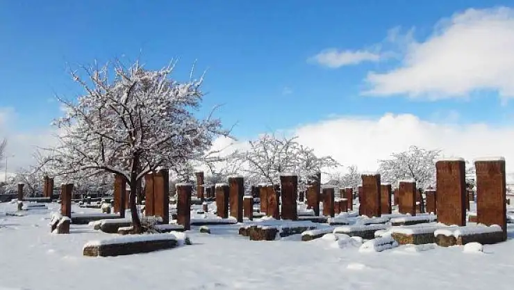 Bitlis'in Ahlat ilçesinde etkili olan Mart karı tarihi mekanlarında kartpostallık görüntüler oluşturdu.