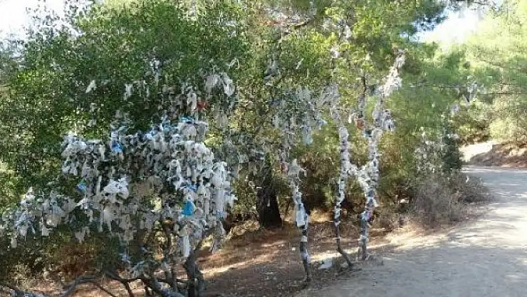 Çanakkale’nin Ayvacık ilçesine bağlı Adatepe Köyü'nde bulunan Zeus Altarı'nı (Sunağı) görmeye gelenler, ağaçlara çaput bağlayarak, dilek tutuyor. 'Dilek ağaçları'ndaki çaputların yerini, bu yıl ziyarete gelenlerin koronavirüsten korunmak için taktıkları cerrahi maskeler aldı. Ağaçlardaki maskeleri görenler, asanlara tepki gösterdi.