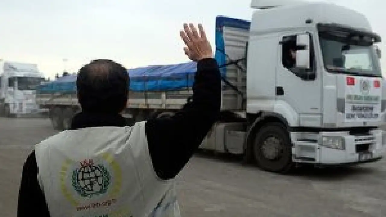 Özkabakçı'nın konuşmasının ardından yardım malzemesi yüklü tırlar, dualar eşliğinde Suriye'ye uğurlandı.
