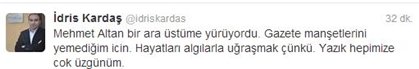 Altan aynı programda konuk olan Bilgi Üniversitesi Küresel Sorunlar Platformu Genel Koordinatörü İdris Kardaş ile de zaman zaman sert tartışmalar yaşadı. Kardaş Twitter adresinden Altan'ın bir ara üstüne yürüdüğünü söyledi.