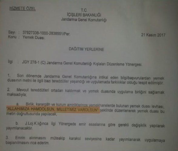 İçişleri Bakanlığı kışlalara genelge gönderdi. Bu genelgeyle birlikte askeriyedeki yemek duası "Tanrımıza hamdolsun, milletimize hamd olsun" yerine "Allah'ımıza hamdolsun, milletimize hamd olsun" diye başlayacak.