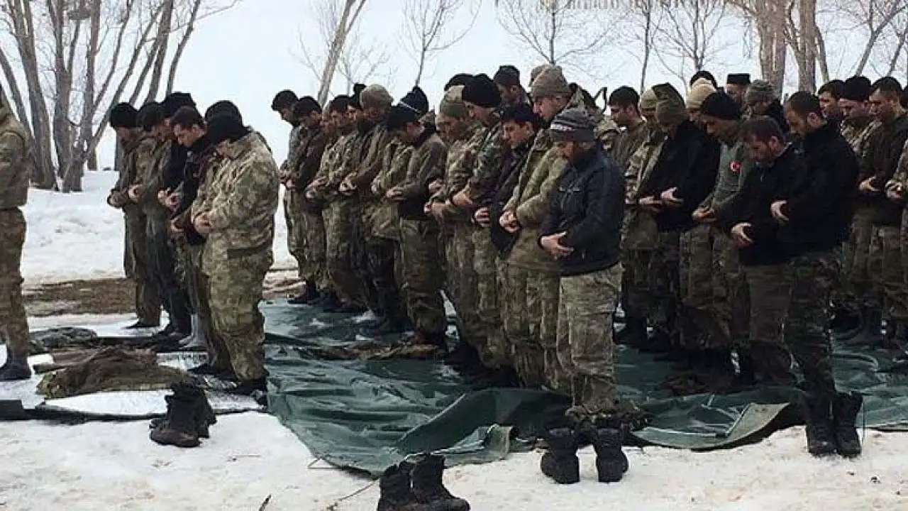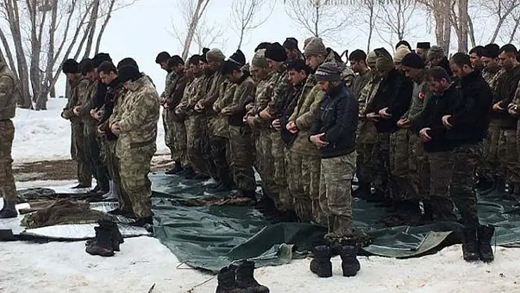Hava soğukluğunu sıfırın altında 13'e kadar düştüğü Tatvan'da görev yapan askerler, kar üzerinde namazlarını kıldı.
