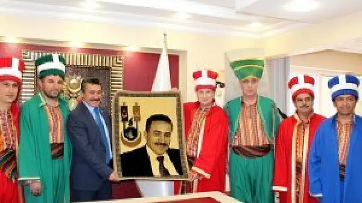 Dernek Başkanı Demirci, ziyarette, Tutal'a halı üzerine dokunmuş belediye başkanının portresini hediye etti.