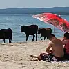 Karadeniz'e sahili bulunan Kırklareli'nin Demirköy ilçesine bağlı İğneadabeldesinde, ineklerin turistlerle aynı plajda "güneşlenmesi", görenleri gülümsetiyor.