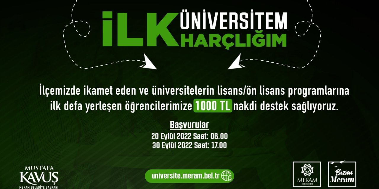 Meram Belediyesi, bu yıl ilk kez üniversiteyi kazanan Meram gençliğine eğitim desteği vereceğini duyurdu. Desteğin müjdesini Meram Belediye Başkanı Mustafa Kavuş verdi. Başkan Kavuş, ilçede ikamet edip yurtiçinde üniversite kazanan Meramlı gençlere 1.000 TL eğitim desteği vereceklerini duyurdu.