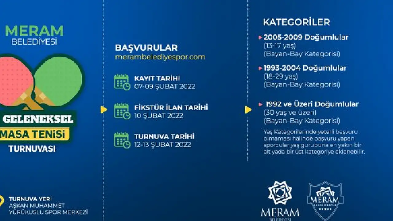 Meram Belediyesi tarafından organize edilen Geleneksel Masa Tenisi Turnuvası'nın üçüncüsü başlıyor. 12-13 Şubat tarihleri arasında gerçekleştirilecek turnuvanın başvuruları ise yarın son bulacak. Meram Belediye Başkanı Mustafa Kavuş, 3 ayrı kategoride gerçekleştirilecek turnuvaya tüm masa tenisi severleri davet etti.