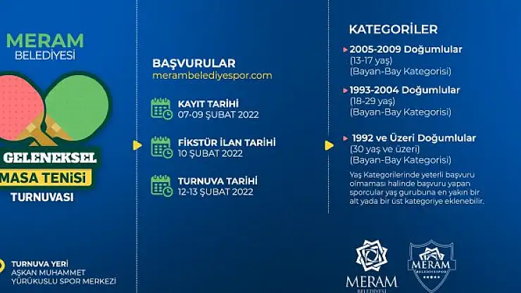 Geçtiğimiz hafta sonu 3. Geleneksel Kort Tenis Kış Turnuvası’nı tamamlayan Meram yeni bir turnuvayla yeni bir heyecana hazırlanıyor. Meram Belediyesi tarafından organize edilen Geleneksel Masa Tenisi Turnuvası’nın üçüncüsü 12-13 Şubat tarihleri arasında gerçekleştirilecek. Dün başlayan turnuva kayıtları 9 Şubat Çarşamba günü son bulacak. Kayıtları merambelediyespor.com adresinden gerçekleştirilebilecek olan turnuva Aşkan Muhammet Yürükuslu Spor Merkezi’nde yapılacak. Fikstür ilanının 10 Şubat günü ilan edileceği karşılaşmalar üç ayrı kategoride olacak. Birinci kategori 2005-2009 doğumlular (13-17 yaş) Bayan-Bay, ikinci kategori 1993-2004 doğumlular (18-29 yaş) Bayan-Bay, son kategori ise 1992 ve üzeri doğumlular (30 Yaş ve üzeri) Bayan-Bay kategorisi olarak belirlendi. Müsabakalarda dereceye giren sporcuları ise çeşitli hediyeler bekliyor.