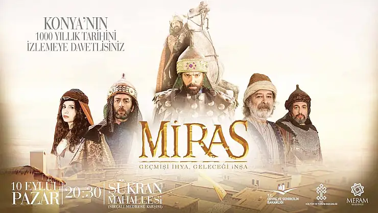 Meram Belediyesi, “Miras” adlı görsel bir şölenle geçmişi gelecekle buluşturacak. Geçmişi ihya ile geleceği inşa için çıkılan bu yolda, Konya'nın 1000 yıllık tarihini izlenecek. Miras görsel şöleni 10 Eylül Pazar günü Saat 20:30’da Şükran Mahallesi Sırçalı Medrese karşısında düzenleyecek. Kültür ve Turizm Bakanlığı’nın katkı ve destekleriyle Meram Belediyesi tarafından hazırlanan programda, 600 metrekare sahnede, 500 metrekare dev ekranda, 3D video mapping şovları, koreografik dans gösterileri, drama ve sahne sanatlarının buluştuğu multidisipliner formatla anlatılacak. Türklerin Orta Asya’dan Anadolu’ya gelişlerinin anlatımıyla başlayan projede Konya, Meram ve kentsel dönüşüm yapılacak olan bölgedeki pek çok anlam ve eserler, geleneğimizdeki anlamlarla buluşturularak bazen bir dervişin dilinden bir emanet, kimi zaman bir sultandan miras edilmiş ve farklı sahne ve dijital sanat modelleri ve yöntemleri kullanılarak yaklaşık 60 dakikalık performans gerçekleştirilecek.