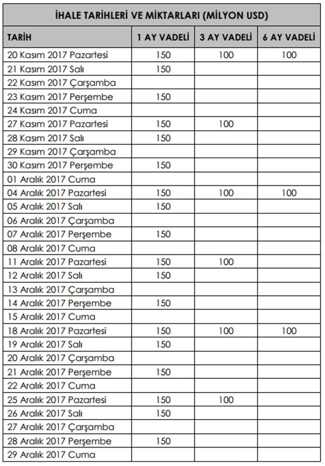 Türkiye Cumhuriyet Merkez Bankası, 2017 yıl sonuna kadar vadeli döviz satım pozisyon tutarının en fazla 3 milyar ABD doları olmasının planlandığını, 2018 yılında gerçekleştirilecek ihalelere ilişkin takvimi kamuoyu ile paylaştı.