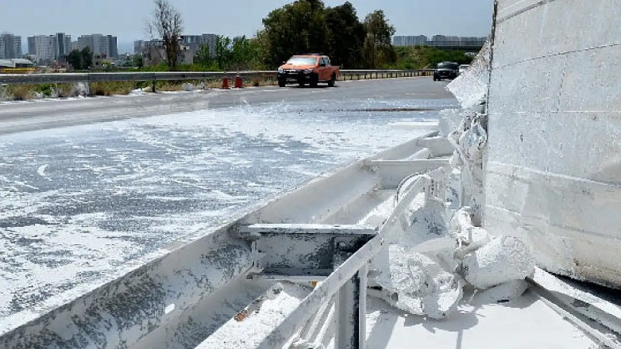Mersin'de boya yüklü kamyonun devrilmesi sonucu otoyol beyaza boyandı.