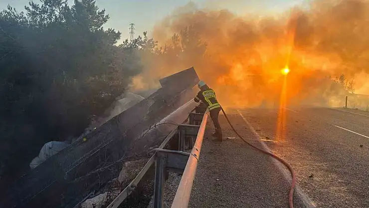 Mersin'in Silifke ilçesinde sürücüsünün direksiyon hakimiyetini kaybettiği balık yemi yüklü tır şarampole uçup alev alev yandı.