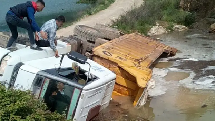 Mersin'in Erdemli ilçesine bağlı Kösbucağı Mahallesi'nde yol çökmesi sonucu, bir hafriyat kamyonu kontrolden çıkarak göle devrildi.