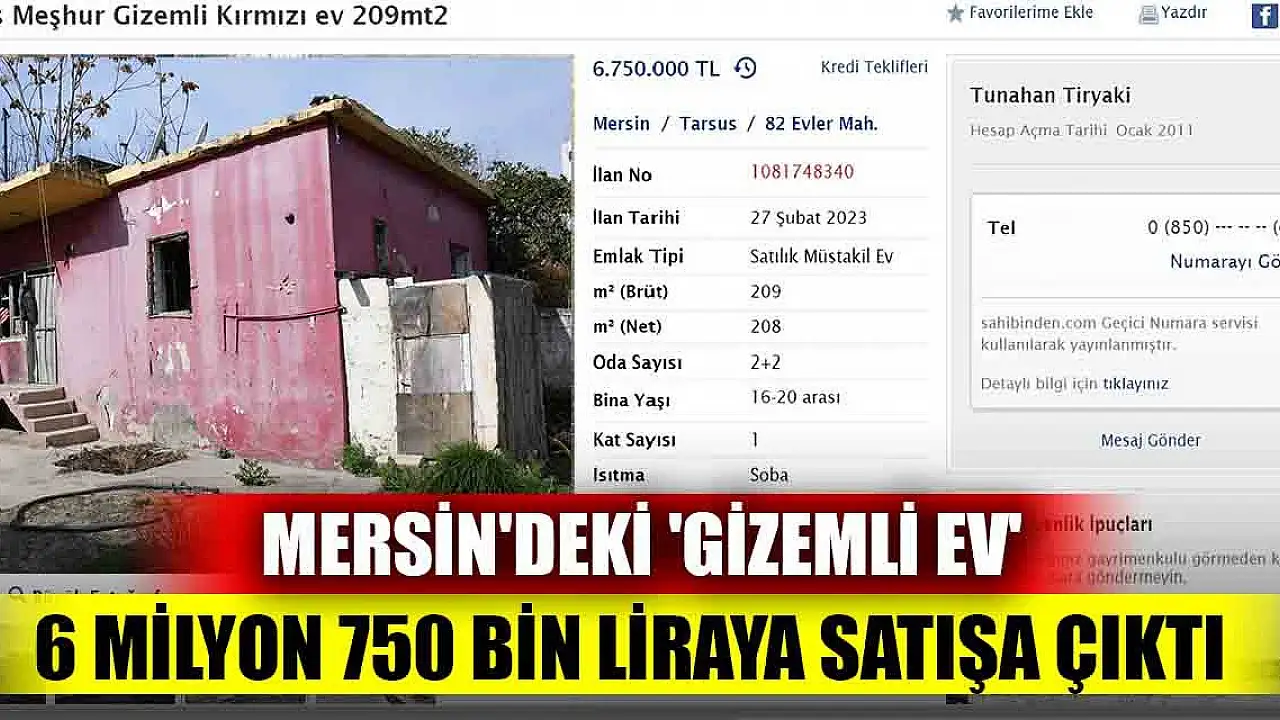 Mersin'in Tarsus ilçesindeki ‘kırmızı ev’ veya ‘gizemli ev’ olarak bilinen konut satışa çıkarıldı. Türkiye'de bir dönem çok konuşulan evi, Türk vatandaşı olmayan kişiler alamayacak. 2016 yılında başlayıp 1 yıl süren kazı, Türkiye'de o dönem çok konuşuldu. Üzerinden yıllar geçti ancak ev gündemden hiç düşmedi. İlçede 82 Evler Mahallesi, 3106 Sokak'ta tek katlı olan ve Türkiye'de 'gizemli ev' olarak bilinen müstakil bir evde, özel harekat polisleri gözetiminde yaklaşık 1 yıl süren gizemli kazı sona ermiş ve alan kapatılmıştı. Sahibi tarafından ev, “Tarsus Meşhur Gizemli Kırmızı ev 209 m2” başlığı altında 6 milyon 750 bin TL satış fiyatıyla ilana çıktı. Satışını duyan mahalle sakinleri, bir an önce evin yeni sahibini bulup, gündemden çıkmasını istedi.