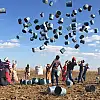 Şanlıurfa'dan Konya'ya giden mevsimlik tarım işçileri, patates toplama işini bitirdikten sonra paydos sevinçlerini kovalarını havaya fırlatarak gösterdi.