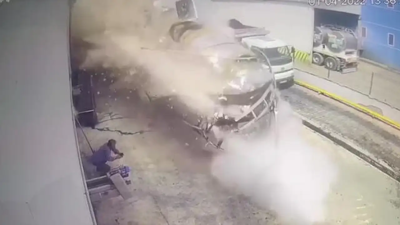 Konya'da, konsantre meyve suyu fabrikasında yüksek basınç nedeniyle buhar kazanının patlama anının güvenlik kamerasına yansıyan görüntüleri ortaya çıktı. Görüntülerde, işçilerden birinin, etrafa dağılan molozlardan yara almadan kurtulduğu anlar yer aldı.