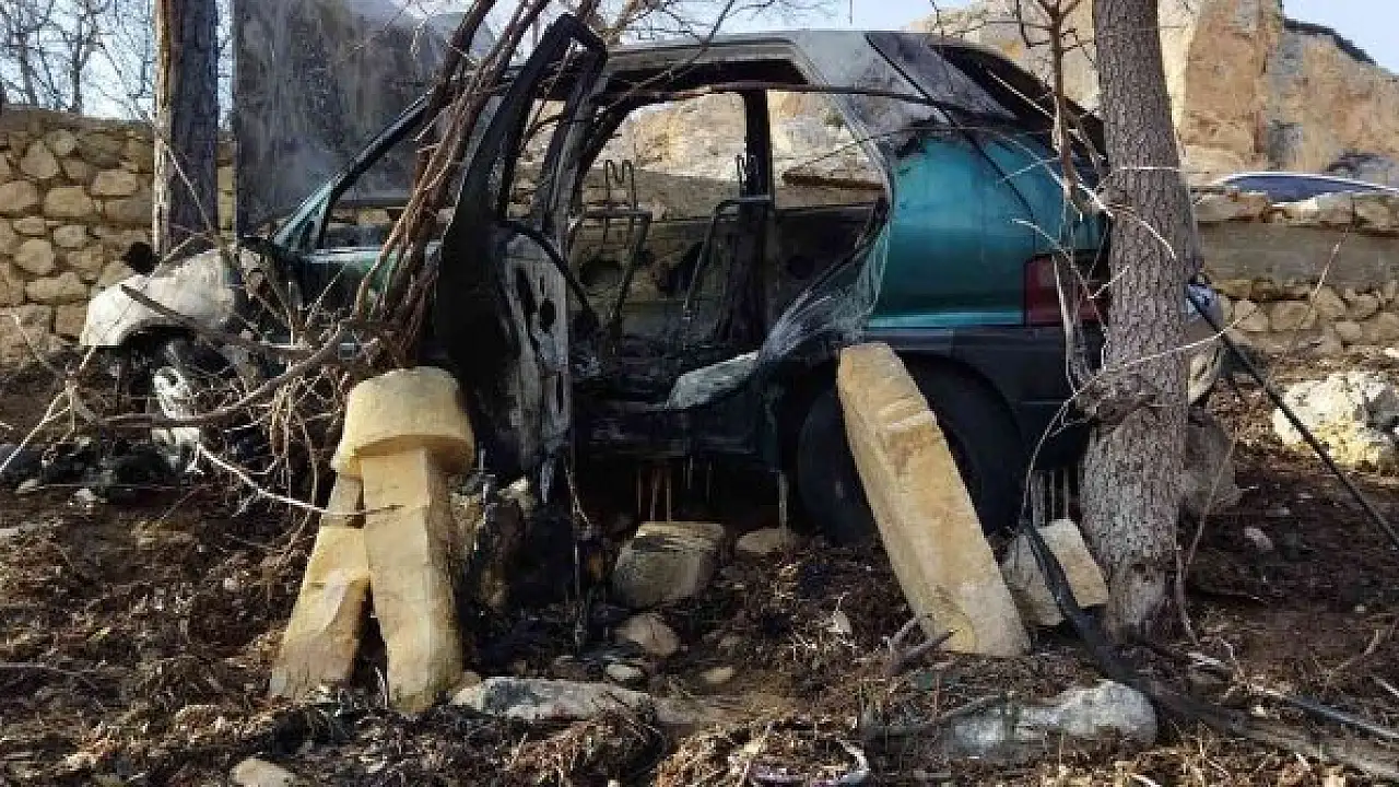 Karaman'ın Ermenek ilçesinde kontrolden çıkarak mezarlığa uçan otomobil yanarak demir yığınına döndü. Sürücünün küçük sıyrıklarla kurtulduğu kaza anı ise güvenlik kamerasına yansıdı.