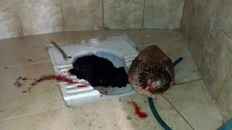 Alanya'da Hacıbaba Mezarlığı'nda bulunan tuvaleti kullanmak isteyen bir kişi, korkunç bir manzarayla karşılaştı. Tuvaletin ön kısmında yolunmuş tüyler ve kan gören vatandaş, alaturka tuvaletin içinde ve yanındaki 2 tavuğu fark etti. Tavuklardan birinin başının kesilerek öldürüldüğünü belirleyen vatandaş, yanında bulunan diğer tavuğu ise kanlar içinde buldu. Tavukların fotoğraflarını çekip sosyal medyada paylaşan vatandaş, bu işi yapanların çocuklara da zarar verebileceğini belirterek çevrede yaşayanları uyardı.