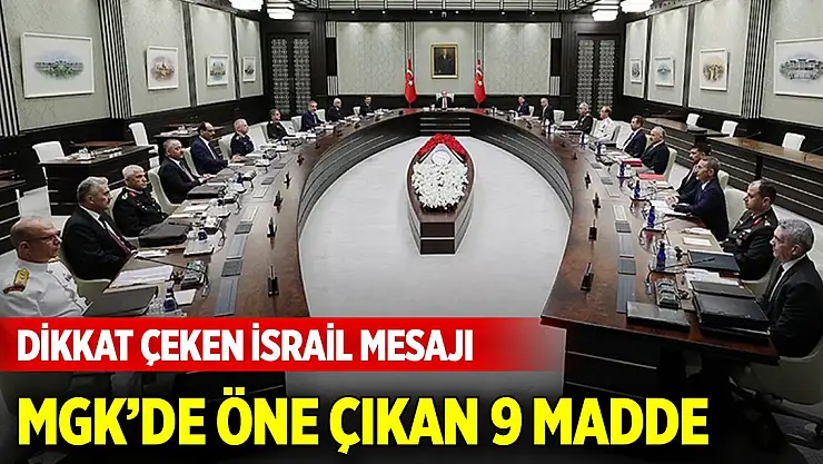 Cumhurbaşkanı Erdoğan başkanlığındaki MGK toplantısı sona erdi. 2 saat 45 dakika süren toplantıda 9 madde öne çıktı. MGK Bildirisinde, 'Uluslararası toplumun tepkisine rağmen hiçbir insani değerle ilişkisi kalmayan İsrail yönetiminin gecikmeksizin durdurulması gerektiği belirtilmiştir.' denildi.