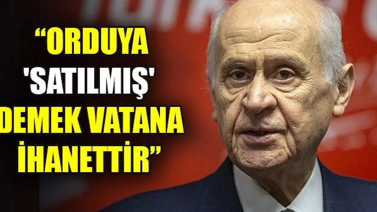 MHP Genel Başkanı Bahçeli, 'Orduya 'satılmış' demek bir defa vatana ihanettir. Hiç kimse bu katıksız ihanete demokrasi maskesi takmasın, ifade özgürlüğü bahanesiyle üzerini örtmeye kalkışmasın.' ifadesini kullandı.