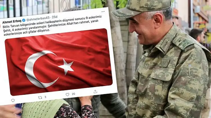 Bitlis'te düşen askeri helikopterde Elazığ 8. Kolordu Komutanı Korgeneral Osman Erbaş şehit oldu. Korgeneral Erbaş'ın kardeşi MHP Kütahya Milletvekili Ahmet Erbaş'ın ağabeyinin şehit olduğunu bilmeden yazdığı taziye mesajı ise yürekleri dağladı.