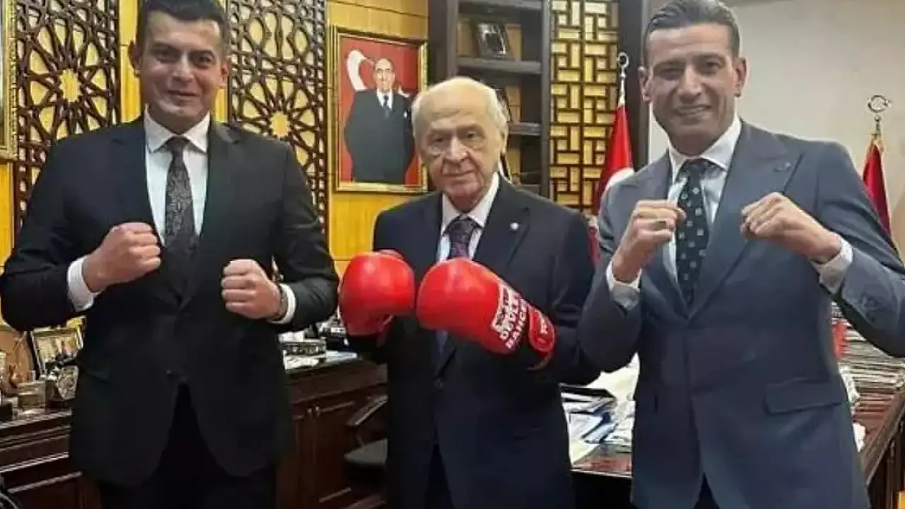 Türkiye Boks Federasyonu yetkilileri, MHP Genel Başkanı Devlet Bahçeli'yi makamında ziyaret etti. Bahçeli, ziyaret sırasında yetkililer tarafından hediye edilen boks eldivenleriyle poz verdi.