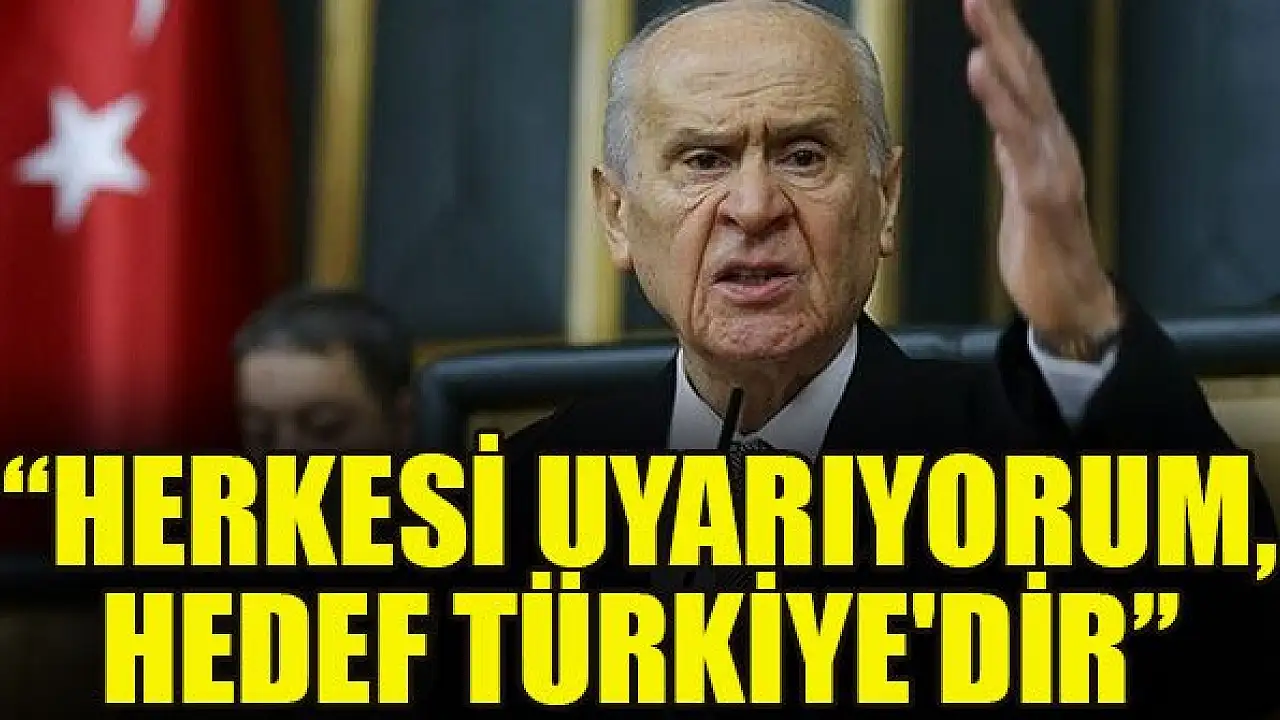Partisinin grup toplantısında konuşan MHP Genel Başkanı Devlet Bahçeli, 'Türkiye'nin çevresindeki sinsi kuşatma sertleşmektedir. Herkesi uyarıyorum, hedef Türkiye'dir' dedi.