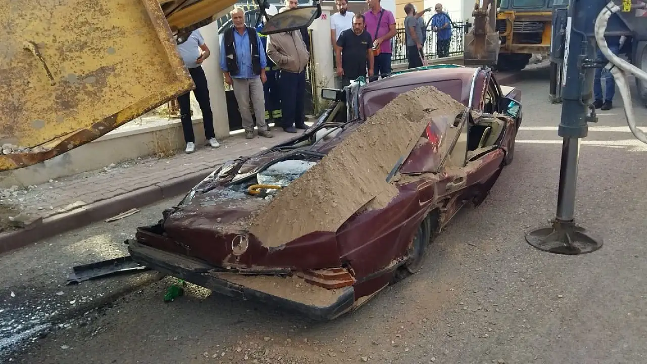 Mıcır yüklü kamyon, otomobilin üzerine devrildi