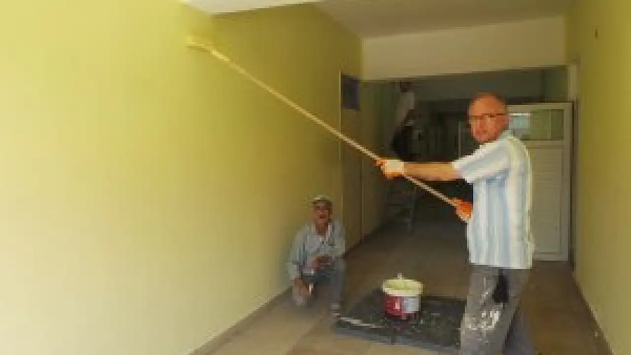Yaz döneminde öğrencilerin olmadığı zamanı değerlendiren okul yönetimi adeta boya ustaları gibi çalışarak, okulun sınıflarını ve koridorlarını pırıl pırıl yapıyor.