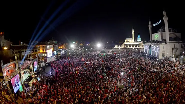 Millet iradesine yapılan darbe girişine karşı Mevlana Meydanı’nda devam eden demokrasi nöbetinin 13. gününde on binlerce Konyalı birlik coşkusunu sürdürdü.